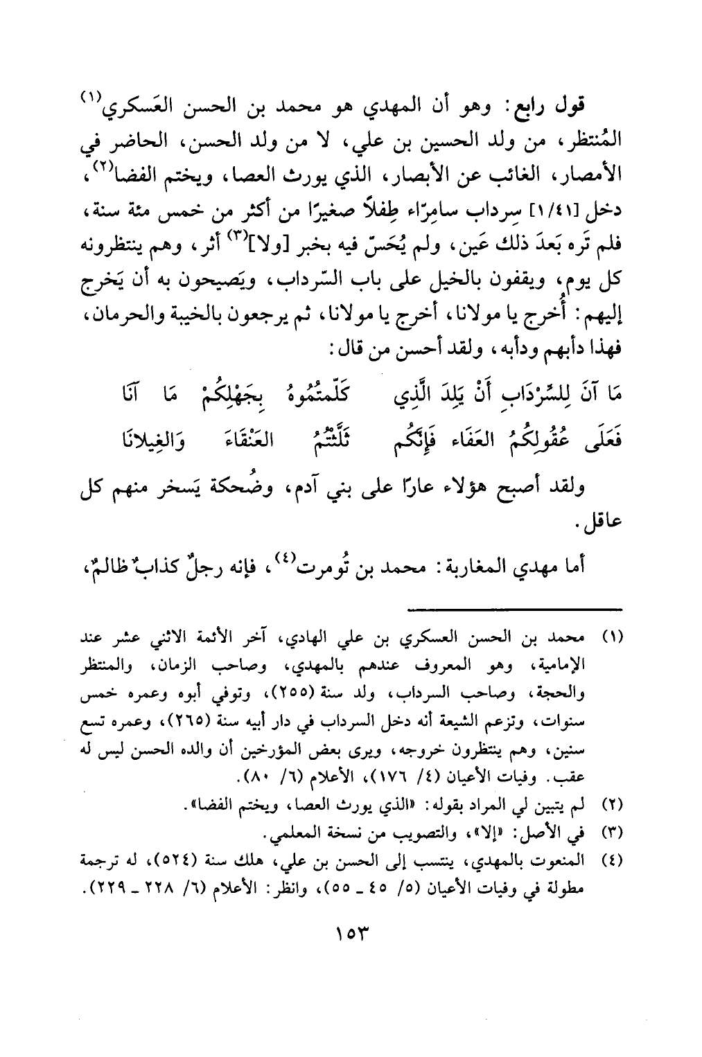 قول رابع: وهو أن المهدي هو محمد بن الحسن العسكري (1)
