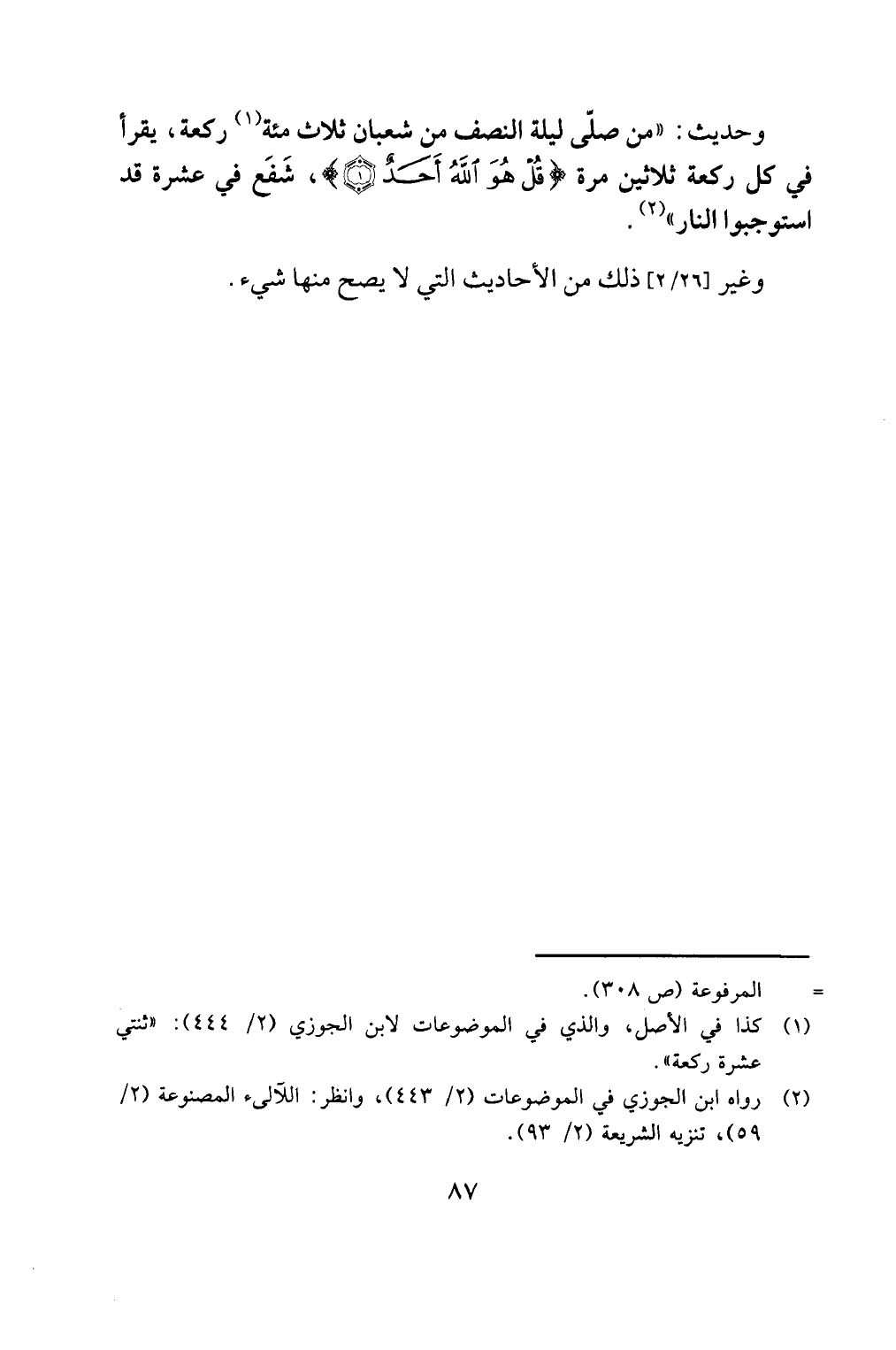 وحديث: " من صلى ليلة النصف من شعبان ثلاث مئة (1) ركعة، يقرأ