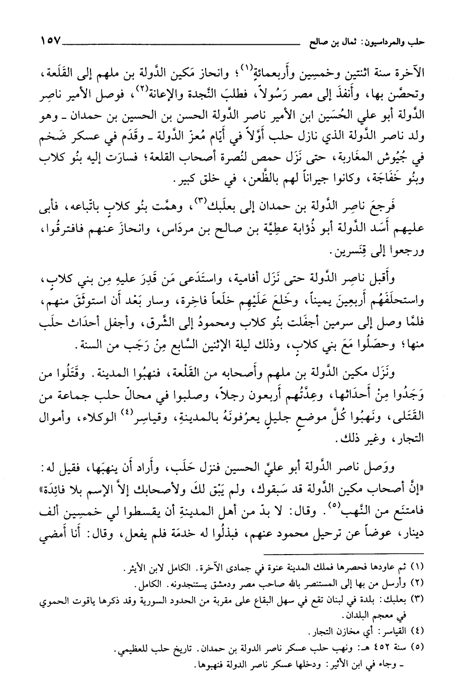 وأقبل ناصر الدولة حتى نزل أفامية، واستدعى من قدر عليه من بني كلاب، واستحلفهم أربعين يميناً، وخلع عليهم خلعاً فاخرة، وسار بعد أن استوثق منهم، فلما وصل إلى سرمين أجفلت بنو كلاب ومحمود إلى الشرق، وأجفل أحداث حلب منها وحصلوا مع بني كلاب، وذلك ليلة الإثنين السابع من رجب من السنة.
