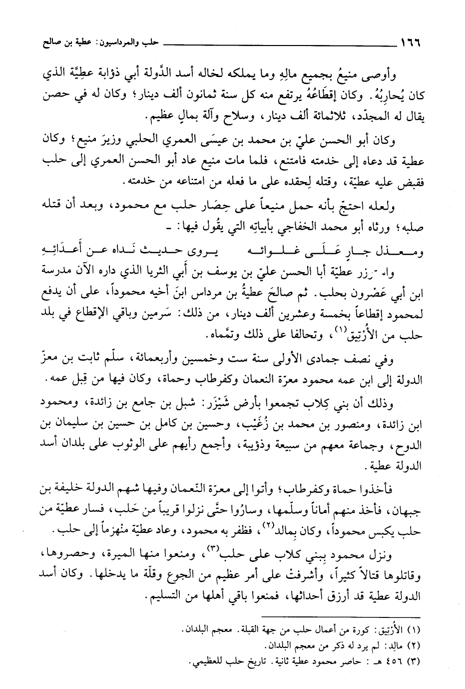 حلب، فسار عطية من حلب يكبس محموداً، وكان بمالد، فظفر به محمود، وعاد عطية منهزماً إلى حلب. ونزل محمود ببني كلاب على حلب، ومنعوا منها الميرة، وحصروها، وقاتلوها قتالاً كثيراً، وأشرفت على أمر عظيم من الجوع وقلة ما يدخلها. وكان أسد الدولة عطية قد أرزق أحداثها، فمنعوا باقي أهلها من التسليم.
