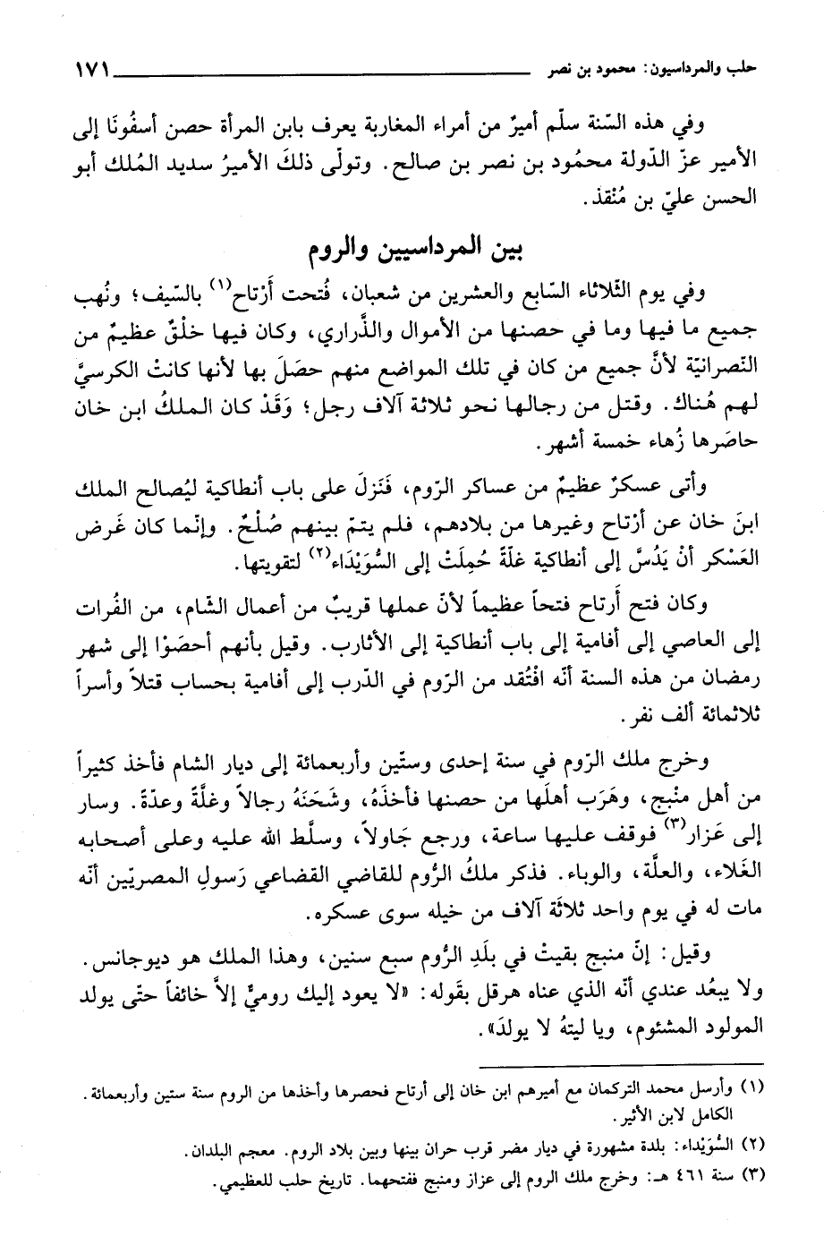 وقيل: إن منبج بقيت في بلد الروم سبع سنين، وهذا الملك هو ديوجانس. ولا يبعد عندي أنه الذي عناه هرقل بقوله: " لا يعود إليك رومي إلا خائفاً حتى يولد المولود المشئوم، ويا ليته لا يولد ".