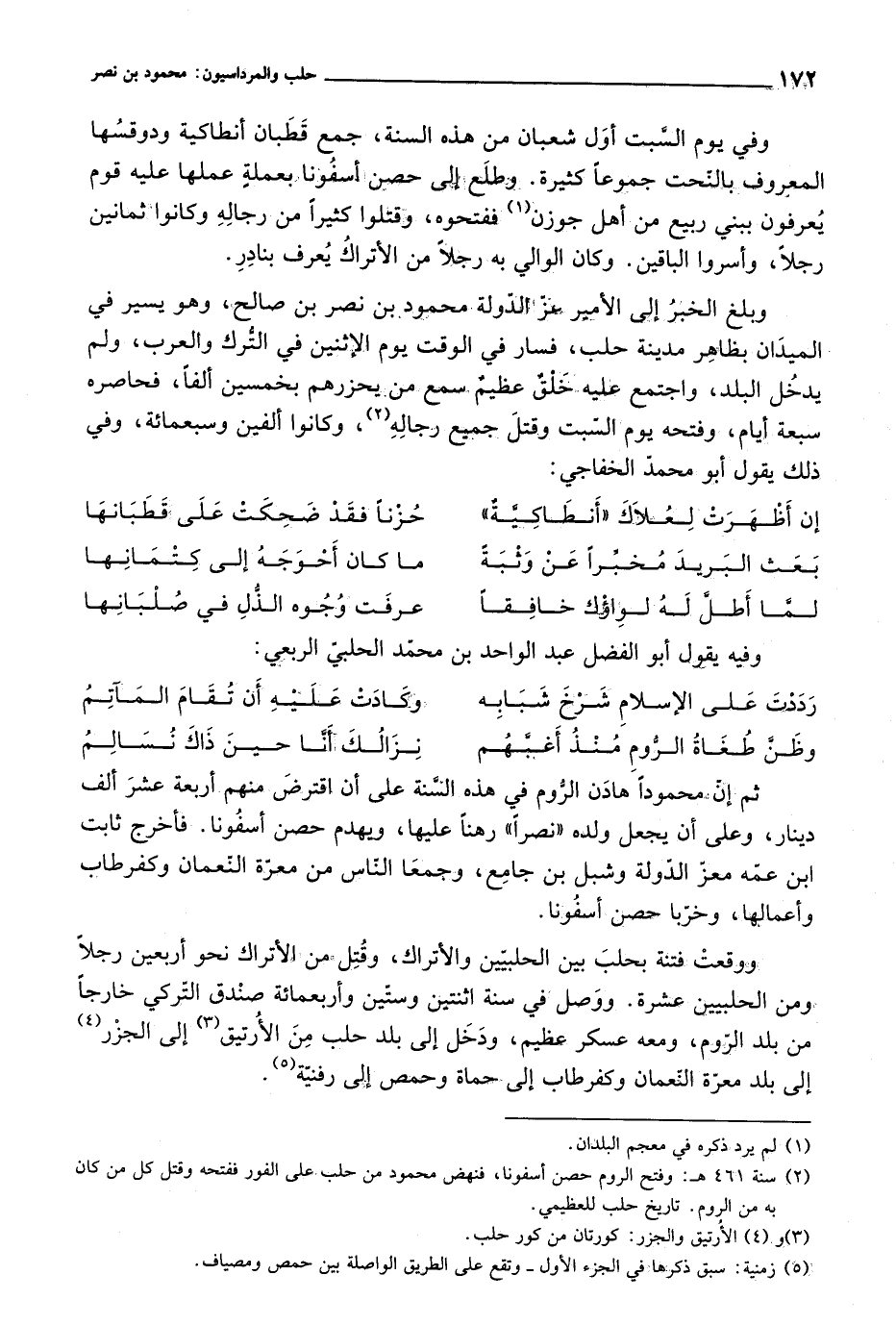 ثم إن محموداً هادن الروم في هذه السنة على أن اقترض منهم أربعة عشر ألف دينار، وعلى أن يجعل ولده نصراً رهناً عليها، ويهدم حصن أسفونا. فأخرج ثابت ابن عمه معز الدولة وشبل بن جامع، وجمعا الناس من معرة النعمان وكفرطاب وأعمالها، وخربا حصن أسفونا.