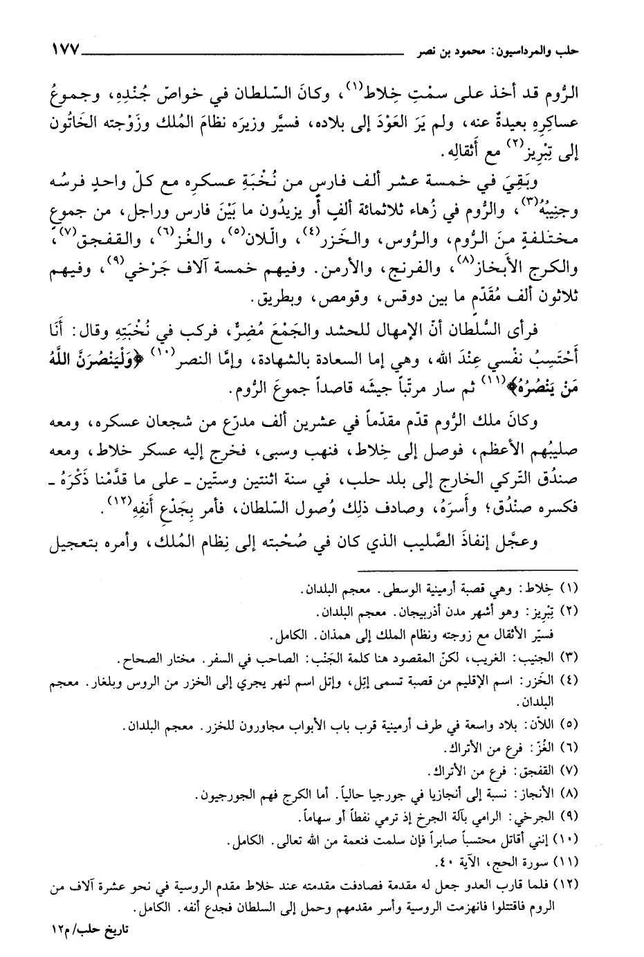 وبقي في خمسة عشر آلف فارس من نخبة عسكره مع كل واحد فرسه وجنيبه، والروم في زهاء ثلاثمائة آلف أو يزيدون ما بين فارس وراجل، من جموع مختلفة من الروم، والروس، والخزر، واللان، والغز، والقفجق، والكرج الأبخاز، والفرنج، والأرمن. وفيهم خمسة آلاف جرخي، وفيهم ثلاثون آلف مقدم ما بين دوقس، وقومص، وبطريق.