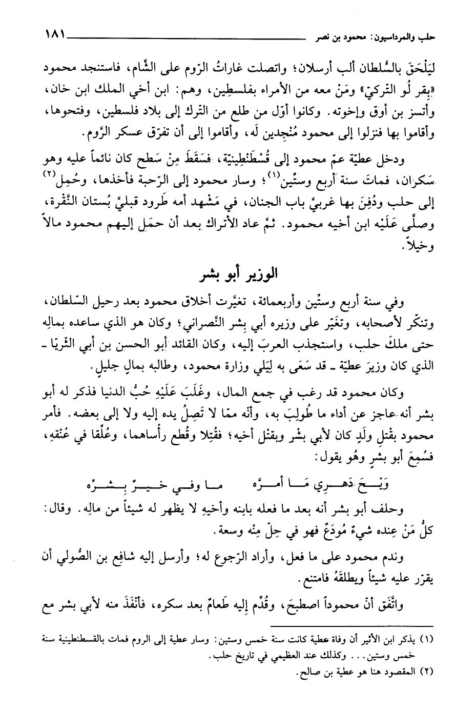 وفي سنة أربع وستين وأربعمائة، تغيرت أخلاق محمود بعد رحيل السلطان، وتنكر لأصحابه، وتغير على وزيره أبي بشر النصراني، وكان هو الذي ساعده بماله حتى ملك حلب، واستجذب العرب إليه، وكان القائد أبو الحسن بن أبي الثريا الذي كان وزير عطية قد سعى به ليلي وزارة محمود، وطالبه بمال جليل.