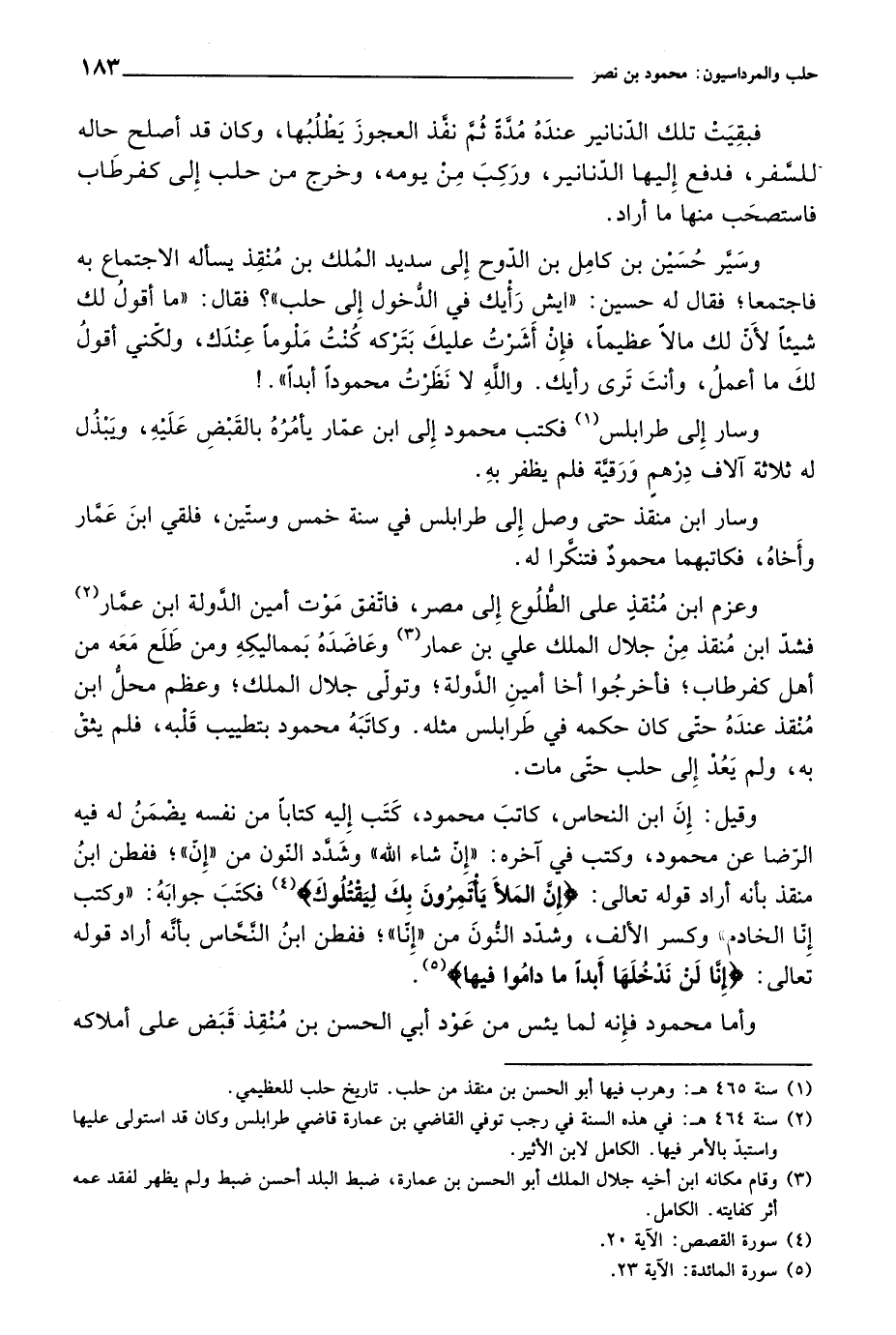 وقيل: إن ابن النحاس، كاتب محمود، كتب إليه كتاباً من نفسه يضمن له الرضا عن محمود، وكتب في آخره: إن شاء الله " وشدد النون من إن، ففطن منقذ بأنه أراد قوله تعالى: " إن الملأ يأتمرون بك ليقتلوك "، فكتب جوابه: وكتب إن الخادم، وكسر الألف، وشدد النون من إنا، ففطن أبن النحاس بأنه أراد قوله تعالى: " إنا لن ندخلها أبداً ما داموا فيها ".