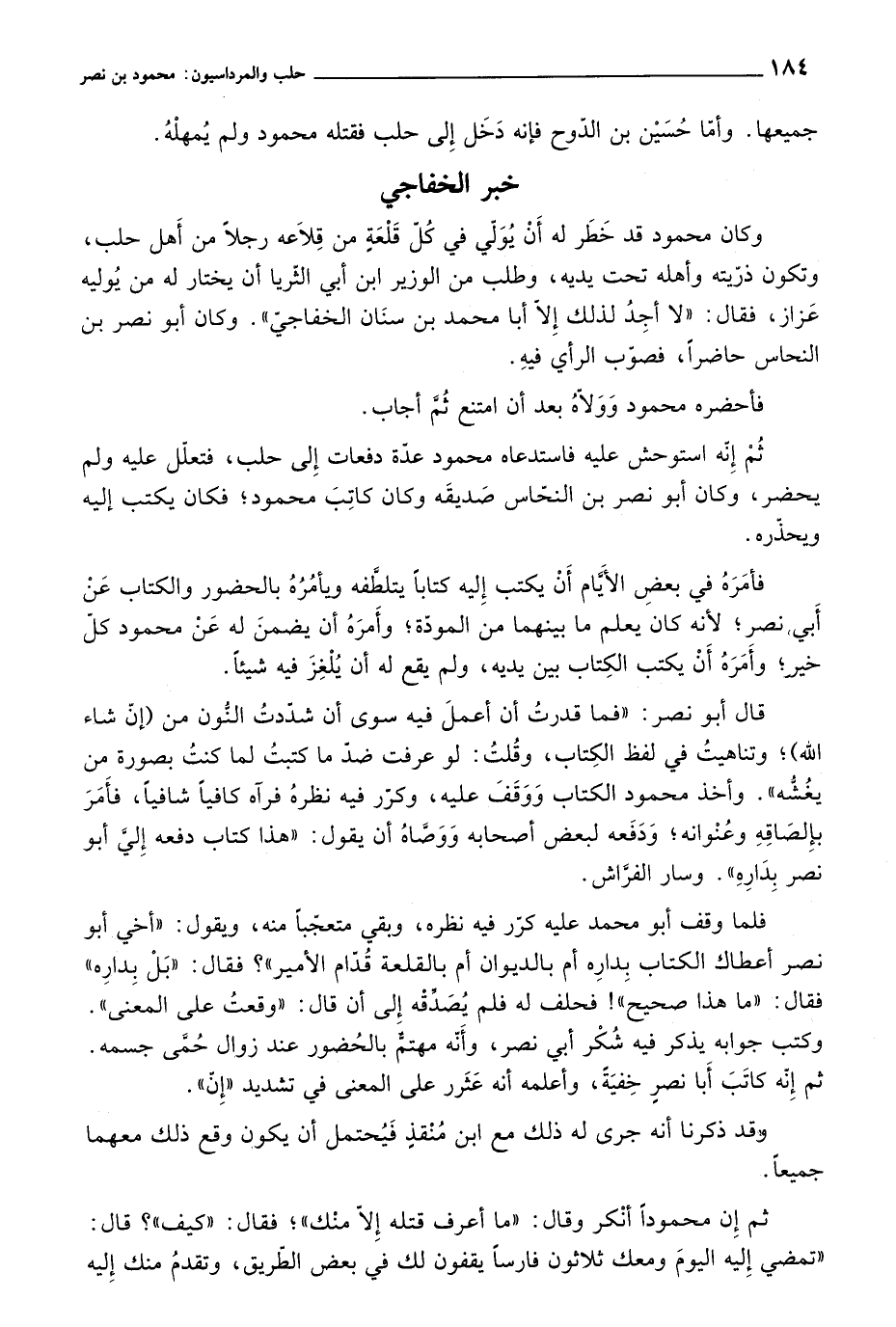 فلما وقف أبو محمد عليه كرر فيه نظره، وبقي متعجباً منه، ويقول: " أخي أبو نصر أعطاك الكتاب بداره أم بالديوان أم بالقلعة قدام الأمير " فقال: " بل بداره " فقال: ما هذا صحيح، فحلف له فلم يصدقه إلى أن قال: " وقعت على المعنى. وكتب جوابه يذكر فيه شكر أبي نصر، وأنه مهتنم بالحضور عند زوال حمى جسمه ثم إنه كاتب أبا نصير خفية، وأعلمه أنه عثرر على المعنى في تشديد " إن ".