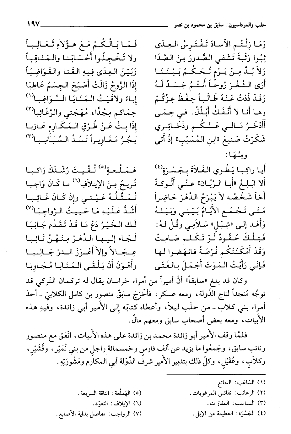 وكان قد بلغ سابقا أن أميراً من أمراء خراسان يقال له تركمان التركي قد توجه منجداً لتاج الدولة، ومعه عسكر، فأخرج سابق منصور بن كامل الكلاب، أحد أمراء بني كلاب من حلب ليلاً، وأعطاه كتابه إلى الأمير أبي زائدة، وفيه هذه الأبيات، ومعه بعض أصحاب سابق ومعهم مال.