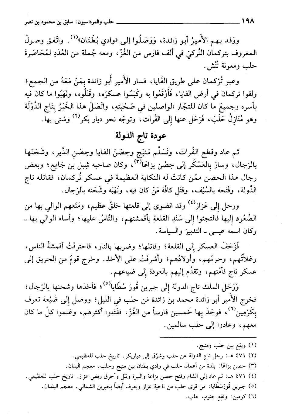 وعبر تركمان على طريق الفايا، فسار الأمير أبو زائدة بمن معه من الجمع، ولقوا تركمان في أرض الفايا، فأوقعوا به وكبسوا عسكره، وقتلوه، ونهبوا ما كان فيه بأسره وجميع ما كان للتجار الواصلين في صحبته، واتصل هذا الخبر بتاج الدولة وهو منازل حلب، فرحل عنها إلى الفرات، وتوجه نحو ديار بكر وشتى بها.