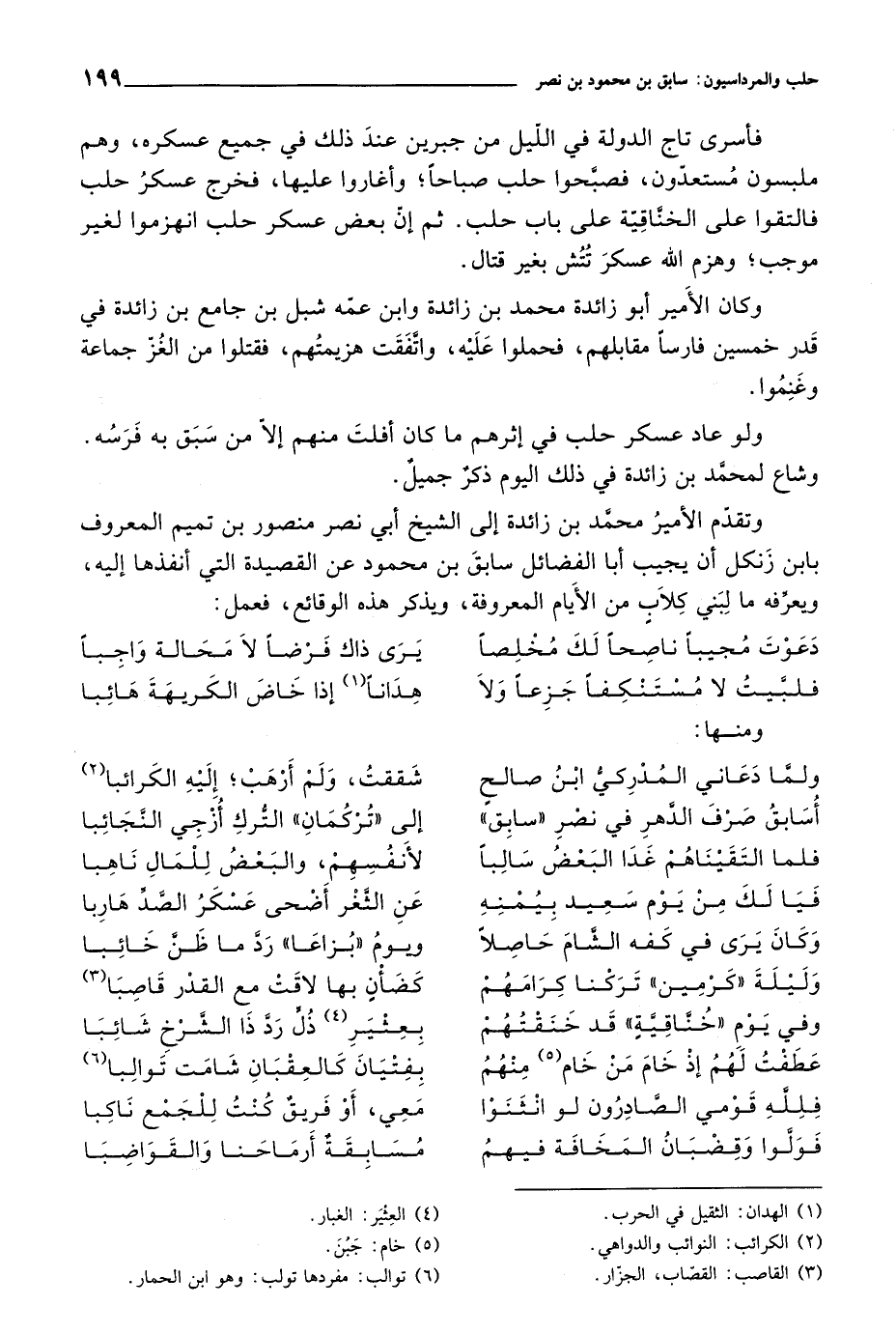 وتقدم الأمير محمد بن زائدة إلى الشيخ أبي نصر منصور بن تميم المعروف بابن زنكل أن يجيب أبا الفضائل سابق بن محمود عن القصيدة التي أنفذها إليه، ويعرفه ما لبني كلاب من الأيام المعروفة، ويذكر هذه الوقائع، فعمل: