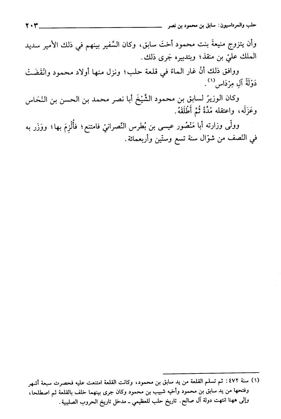 ووافق ذلك أن غار الماء في قلعة حلب، ونزل منها أولاد محمود وانقضت دولة آل مرداس وكان الوزير لسابق بن محمود الشيخ أبا نصر محمد بن الحسن بن النحاس وعزله، واعتقله مدة ثم أطلقه.