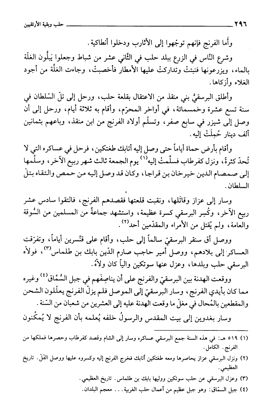 وأطلق البرسقي بني منقذ من الاعتقال بقلعة حلب، ورحل إلى تل السلطان في سنة تسع عشرة وخمسمائة، في أواخر المحرم، وأقام به ثلاثة أيام، ورحل إلى أن وصل إلى شيزر في سابع صفر، وتسلم أولاد الفرنج من ابن منقذ، وباعهم بثمانين ألف دينار حملت إليه.