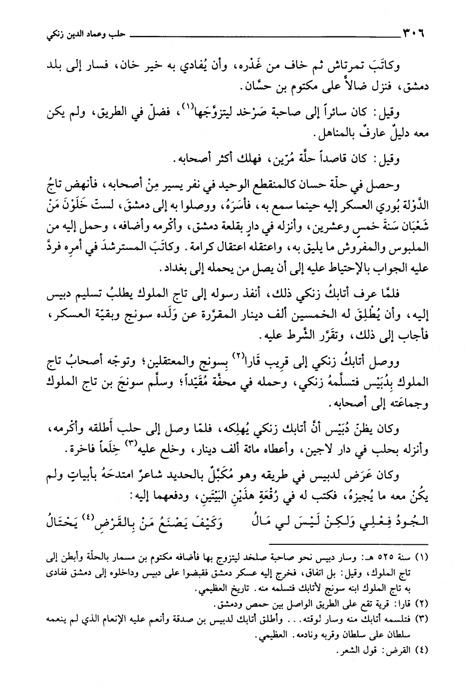 وكان يظن دبيس أن أتابك زنكي يهلكه، فلما وصل إلى حلب أطلقه وأكرمه، وأنزله بحلب في دار لاجين، وأعطاه مائة ألف دينار، وخلع عليه خلعاً فاخرة. وكان عرض لدبيس في طريقه وهو مكبل بالحديد شاعر امتدحه بأبيات ولم يكن معه ما يجيزه، فكتب له في رقعة هذين البيتين، ودفعهما إليه: