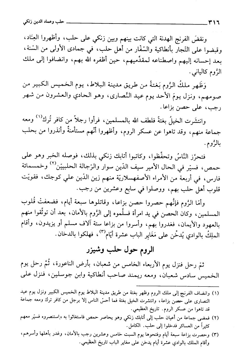 ونقض الفرنج الهدنة التي كانت بينهم وبين زنكي على حلب، وأظهروا العناد، وقبضوا على التجار بأنطاكية والسفار من أهل حلب، في جمادى الأولى من السنة، بعد إحسانه إليهم واصطناعه لمقدميهم، حين أظفره الله بهم، وانضافوا إلى ملك الروم كالياني.