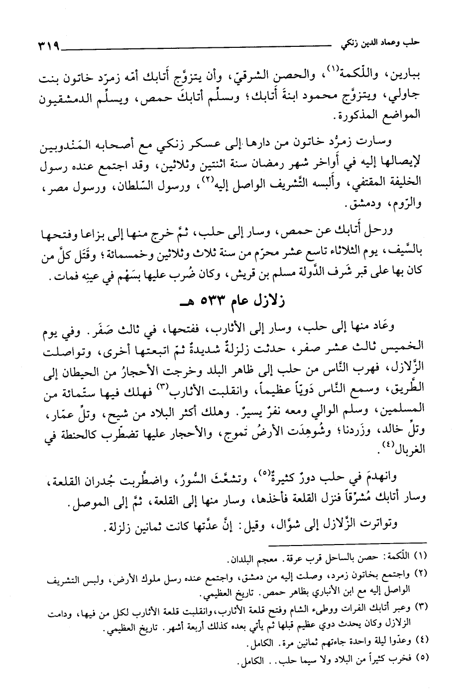 وانهدم في حلب دور كثيرة، وتشعث السور، واضطربت جدران القلعة، وسار أتابك مشرقاً فنزل القلعة فأخذها، وسار منها إلى القلعة، ثم إلى الموصل. وتواترت الزلازل إلى شوال، وقيل: إن عدتها كانت ثمانين زلزلة.