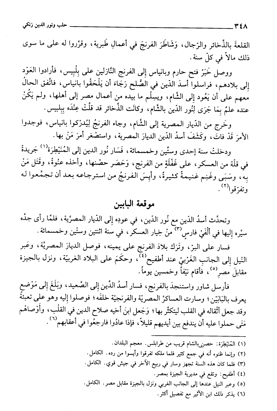 فأرسل شاور واستنجد بالفرنج، فسار أسد الدين إلى الصعيد، وبلغ إلى موضع يعرف بالبابين، وسارت العساكر المصرية والفرنجية خلفه، فوصلوا إليه وهو على تعبئة وقد جعل أثقاله في القلب ليتكثر بها، وجعل ابن أخيه صلاح الدين في القلب، وأوصاهم متى حملوا عليه أن يندفع بين أيديهم قليلاً، فإذا عادوا فارجعوا في أعقابهم.