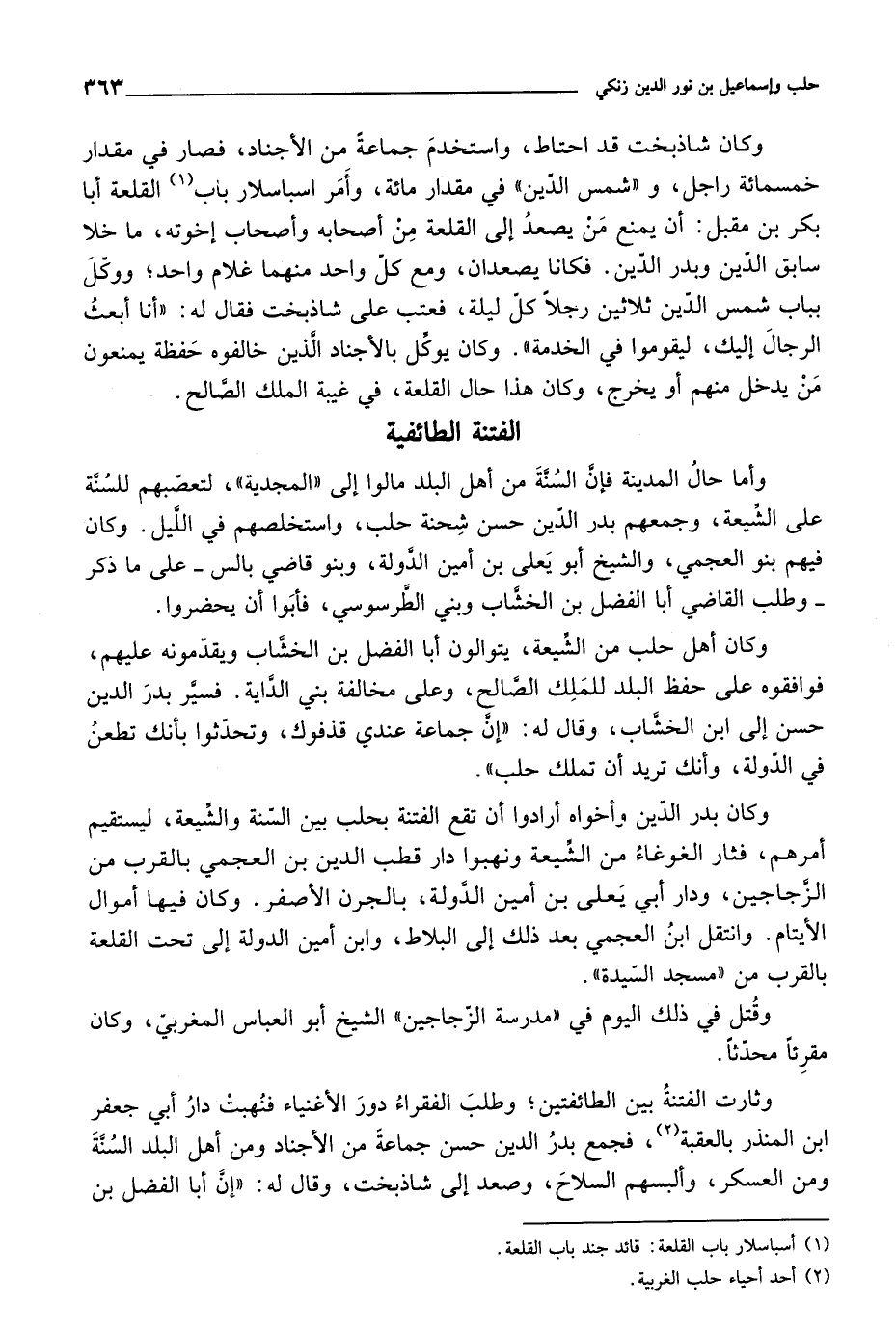 وأما حال المدينة فإن السنة من أهل البلد مالوا إلى المجدية، لتعصبهم للسنة على الشيعة، وجمعهم بدر الدين حسن شحنة حلب، واستخلصهم في الليل. وكان فيهم بنو العجمي، والشيخ أبو يعلى بن أمين الدولة، وبنو قاضي بالس على ما ذكر وطلب القاضي أبا الفضل بن الخشاب وبني الطرسوسي، فأبوا أن يحضروا.