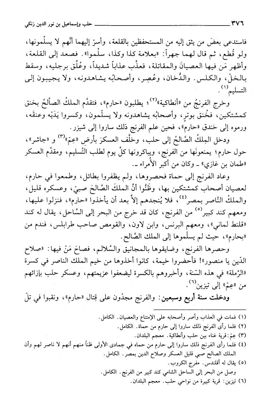 ودخل الملك الصالح إلى حلب، وخلف العسكر بأرض عم وجاشر، حول حارم، يمنعونها من الفرنج، ويباكرونها كل يوم لطلب التسليم، ومقدم العسكر طمان بن غازي وكان من أكبر الأمراء.