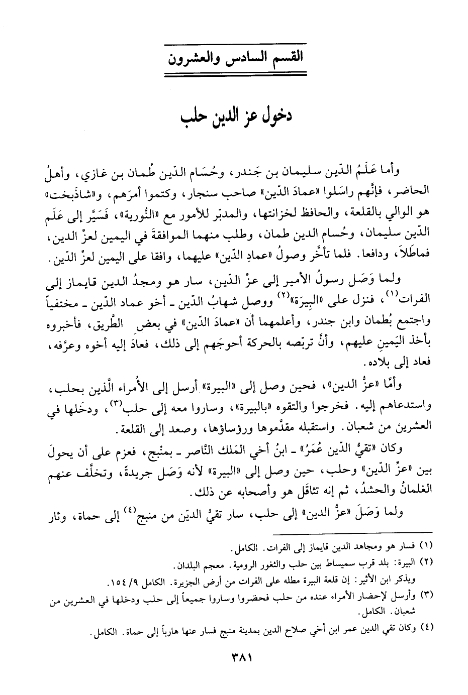 وأما عز الدين، فحين وصل إلى البيرة أرسل إلى الأمراء الدين بحلب، واستدعاهم إليه. فخرجوا والتقوه بالبيرة، وساروا معه إلى حلب، ودخلها في العشرين من شعبان. واستقبله مقدموها ورؤساؤها، وصعد إلى القلعة.