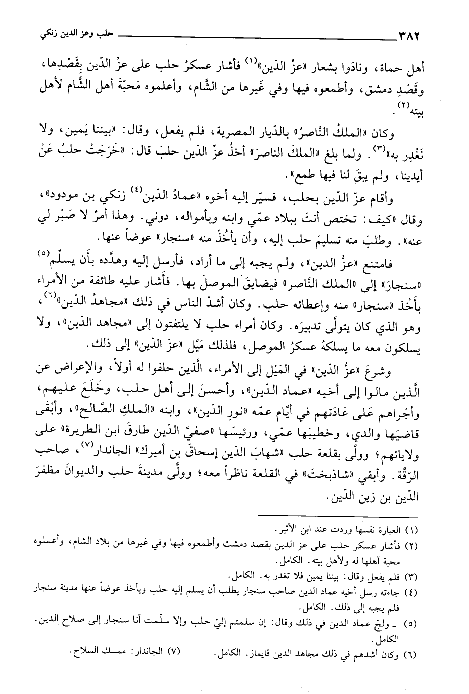 وأقام عز الدين بحلب، فسير إليه أخوه عماد الدين زنكي بن مودود، وقال كيف: تختص أنت ببلاد عمي وابنه وبأمواله، دوني. وهذا أمر لا صبر لي عنه. وطلب منه تسليم حلب إليه، وأن يأخذ منه سنجار عوضاً عنها.