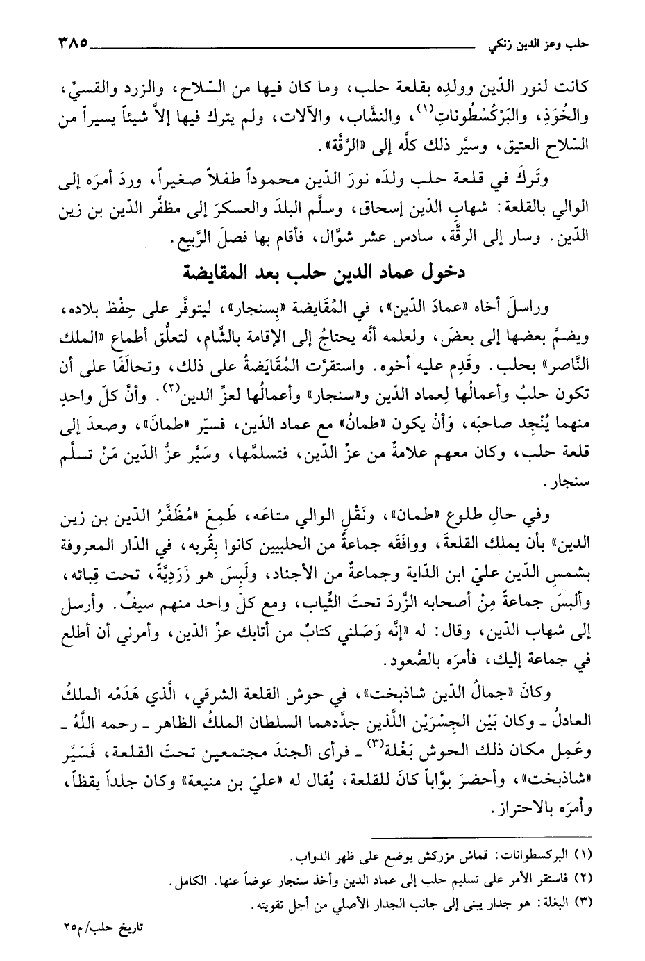 كانت لنور الدين وولده بقلعة حلب، وما كان فيها من السلاح، والزرد والقسي، والخوذ، والبركسطونات، والنشاب، والآلات، ولم يترك فيها إلا شيئاً يسيراً من السلاح العتيق، وسير ذلك كله إلى الرقة.
