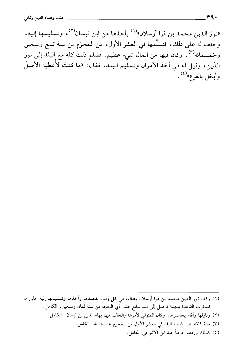 نور الدين محمد بن قرا أرسلان بأخذها من ابن نيسان، وتسليمها إليه، وحلف له على ذلك، فتسلمها في العشر الأول، من المحرم من سنة تسع وسبعين وخمسمائة. وكان فيها من المال شيء عظيم. فسلم ذلك كله مع البلد إلى نور الدين، وقيل له في أخذ الأموال وتسليم البلد، فقال: ما كنت لأعطيه الأصل وأبخل بالفرع.