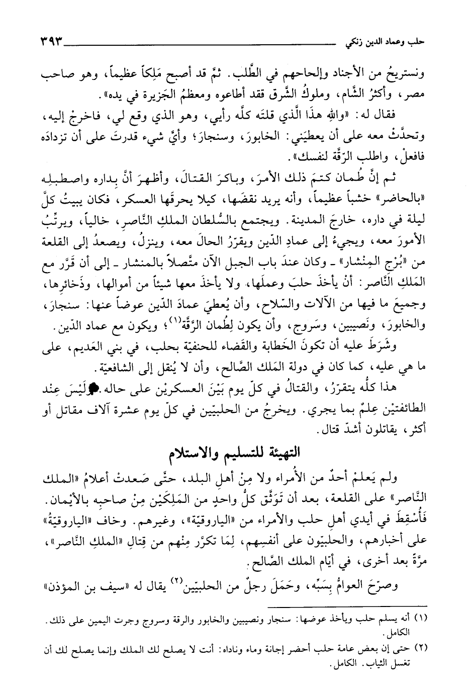 ولم يعلم أحد من الأمراء ولا من أهل البلد، حتى صعدت أعلام الملك الناصر على القلعة، بعد أن توثق كل واحد من الملكين من صاحبه بالأيمان. فأسقط في أيدي أهل حلب والأمراء من الياروقية، وغيرهم. وخاف الياروقية على أخبارهم، والحلبيون على أنفسهم، تكرر منهم من قتال الملك الناصر، مرة بعد أخرى، في أيام الملك الصالح.