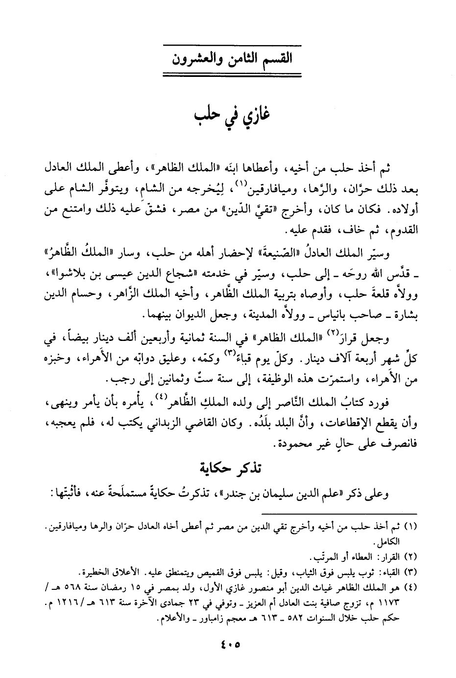 ثم أخذ حلب من أخيه، وأعطاها ابنه الملك الظاهر، وأعطى الملك العادل بعد ذلك حران، والرها، وميافارقين، ليخرجه من الشام، ويتوفر الشام عاى أولاده. فكان ما كان، وأخرج تقي الدين من مصر، فشق عليه ذلك وامتنع االقدوم، ثم خاف، فقدم عليه.