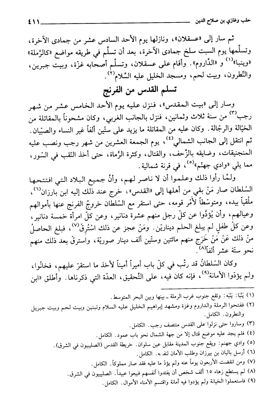 ولما رأوا ذلك وعلموا أن لا ناصر لهم، وأن جميع البلاد التي افتتحها السلطان صار من بقي من أهلها إلى القدس، خرج عند ذلك إليه ابن بارزان، ملقياً بيده، ومتوسطاً لأمر قومه، حتى استقر مع السلطان خزوج الفرنج عنها بأموالهم وعيالهم، وأن يؤدوا عن كل رجل منهم عشرة دنانير، وعن كل امرأة خمسة دنانير، وعن كل طفل لم يبلغ الحلم دينارين. ومن عجز عن ذلك استرق، فبلغ الحاصل من ذلك عن من خرج منهم مائتين وستين ألف دينار صورية، واسترق بعد ذلك منهم نحو ستة عشر ألفا.