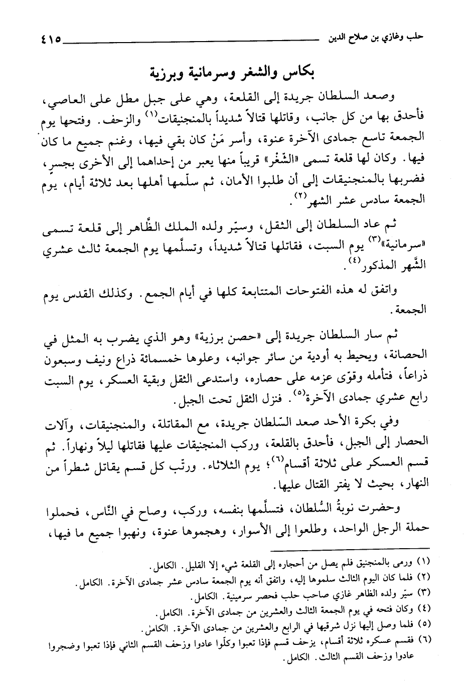 واتفق له هذه الفتوحات المتتابعة كلها في أيام الجمع. وكذلك القدس يوم الجمعة. ثم سار السلطان جريدة إلى حصن برزية وهو الذي يضرب به المثل في الحصانة، ويحيط به أودية من سائر جوانبه، وعلوها خمسمائة ذراع ونيف وسبعون ذراعاً، فتأمله وقوى عزمه على حصاره، واستدعى الثقل وبقية العسكر، يوم السبت رابع عشري جمادى الآخرة. فنزل الثقل تحت الجبل.
