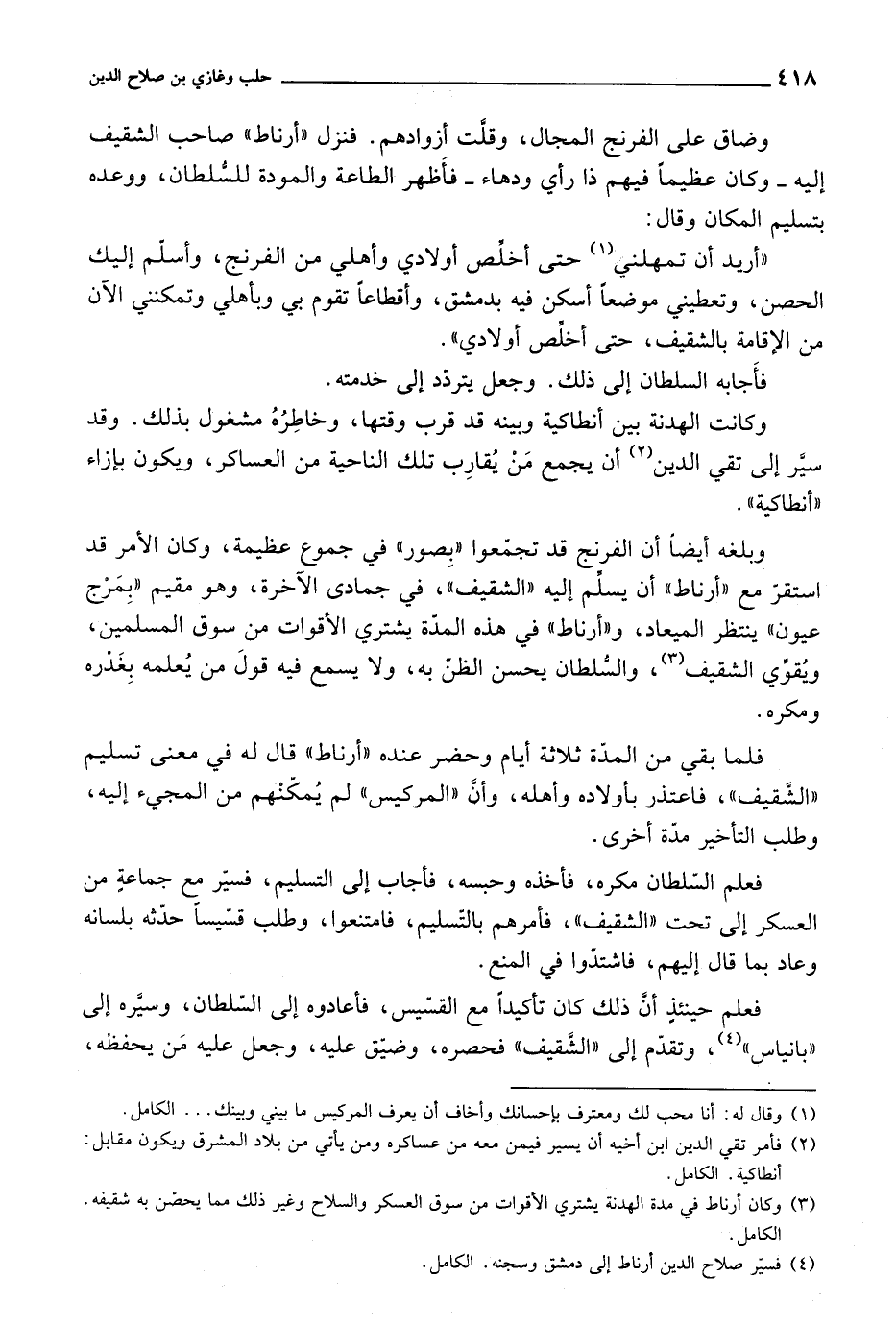 وضاق على الفرنج المجال، وقلت أزوادهم. فنزل أرناط صاحب الشقيف إليه وكان عظيماً فيهم ذا رأي ودهاء، فأظهر الطاعة والمودة للسلطان، ووعده بتسليم المكان وقال: أريد أن تمهلني حتى أخلص أولادي وأهلي من الفرنج، وأسلم إليك الحصن، وتعطيني موضعاً أسكن فيه بدمشق، وأقطاعاً تقوم بي وبأهلي وتمكنني الآن من الإقامة بالشقيف، حتى أخلص أولادي.