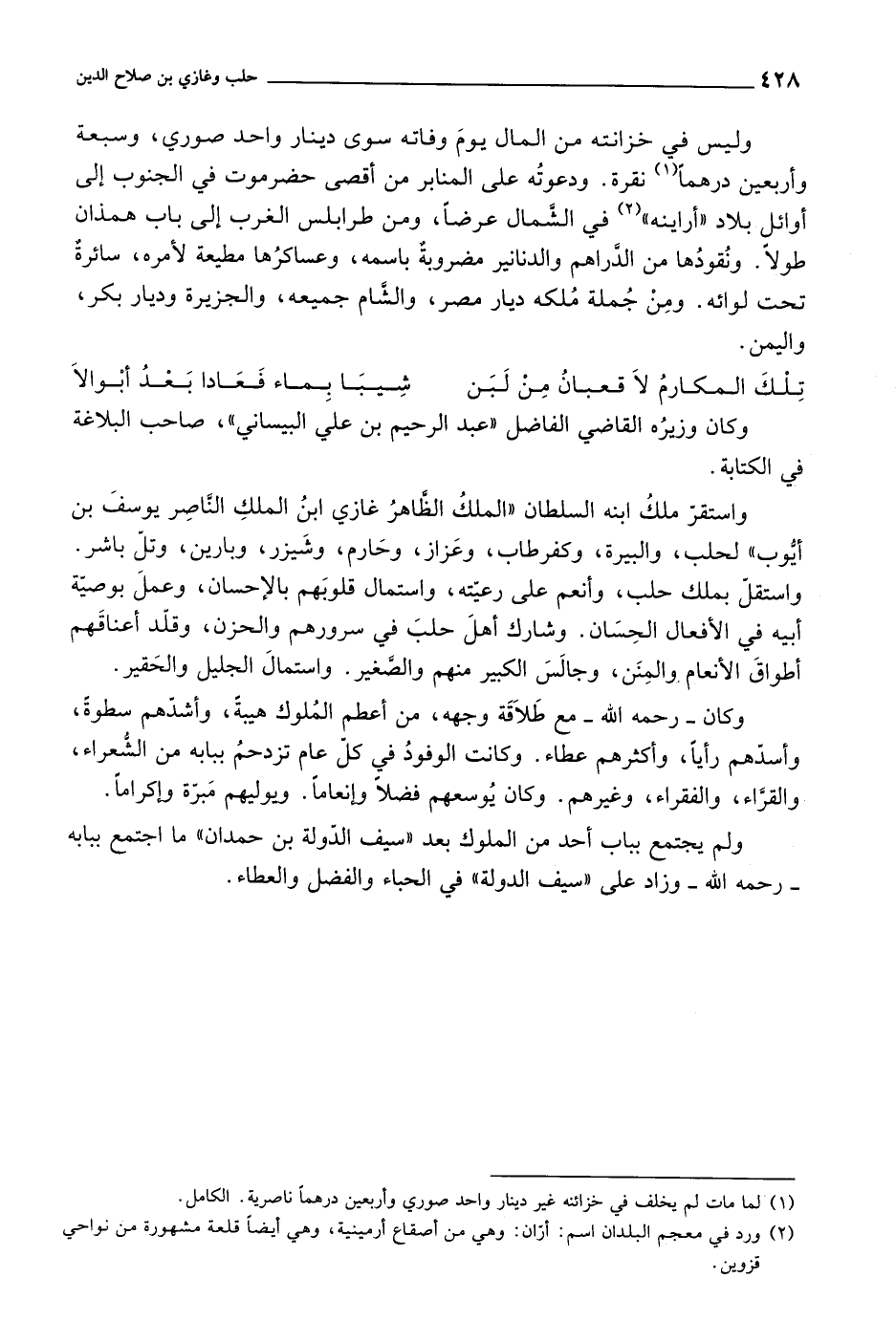 واستقر ملك ابنه السلطان الملك الظاهر غازي ابن الملك الناصر يوسف بن أيوب لحلب، والبيرة، وكفر طاب، وعزاز، وحارم، وشيزر، وبارين، وتل باشر. واستقل بملك حلب، وأنعم على رعيته، واستمال قلوبهم بالإحسان، وعمل بوصية أبيه في الأفعال الحسان. وشارك أهل حلب في سرورهم والحزن، وقلد أعناقهم أطواق الأنعام والمنن، وجالس الكبير منهم والصغير. واستمال الجليل والحقير. وكان رحمه الله مع طلاقة وجهه، من أعظم الملوك هيبة، وأشدهم سطوة، وأسدهم رأياً، وأكثرهم عطاء. وكانت الوفود في كل عام تزدحم ببابه من الشعراء، والقراء، والفقراء، وغيرهم. وكان يوسعهم فضلاً وإنعاماً. ويوليهم مبرة وإكراماً.