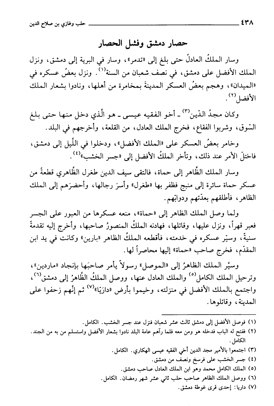 وسار الملك العادل حتى بلغ إلى تدمر، وسار في البرية إلى دمشق، ونزل الملك الأفضل على دمشق، في نصف شعبان من السنة. ونزل بعض عسكره في الميدان، وهجم بعض العسكر المدينة بمخامرة من أهلها، ونادوا بشعار الملك الأفضل.