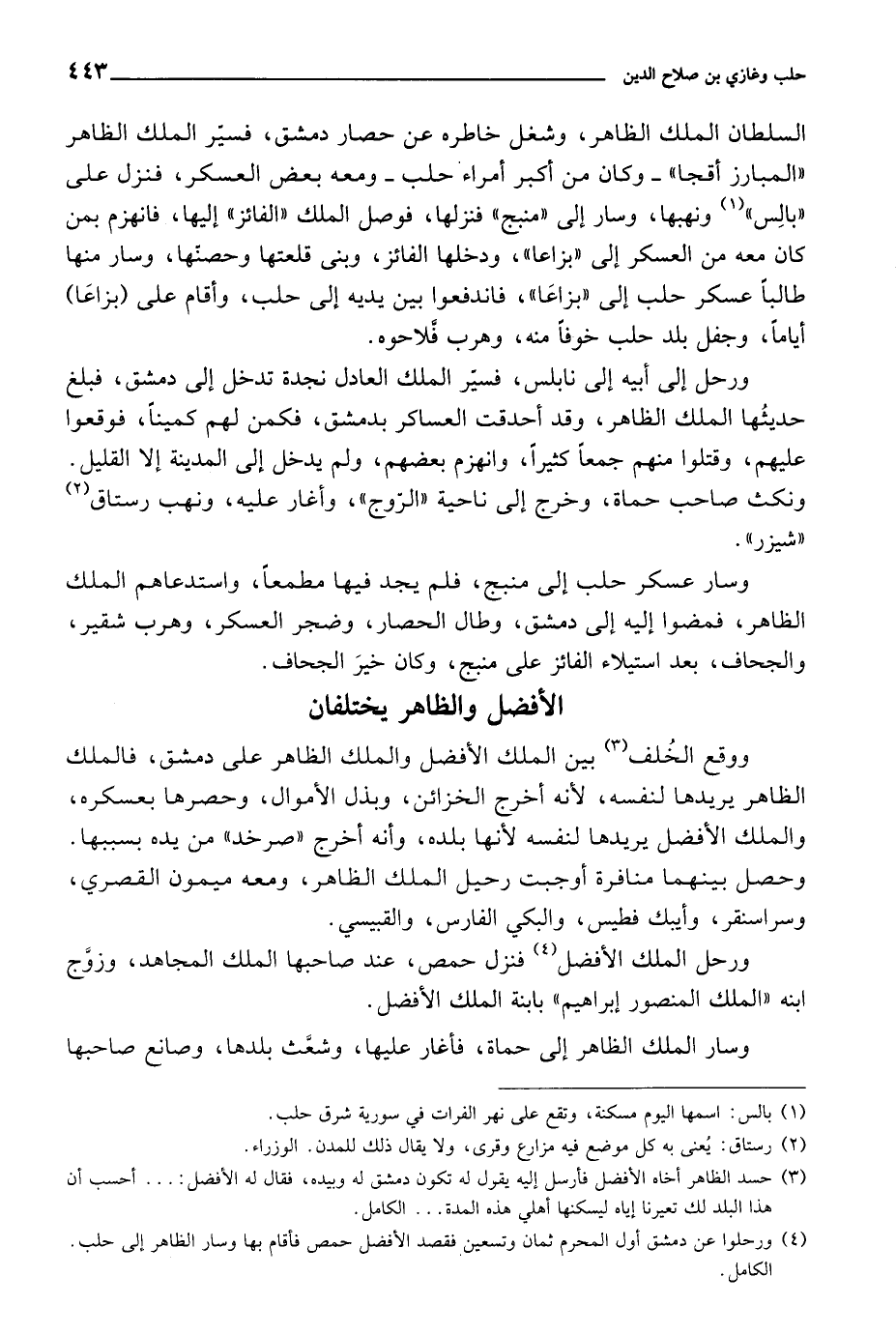 ووقع الخلف بين الملك الأفضل والملك الظاهر على دمشق، فالملك الظاهر يريدها لنفسه، لأنه أخرج الخزائن، وبذل الأموال، وحصرها بعسكره، والملك الأفضل يريدها لنفسه لأنها بلده، وأنه أخرج صرخد من يده بسببها. وحصل بينهما منافرة أوجبت رحيل الملك الظاهر، ومعه ميمون القصري، وسراسنقر، وأيبك فطيس، والبكي الفارس، والقبيسي.