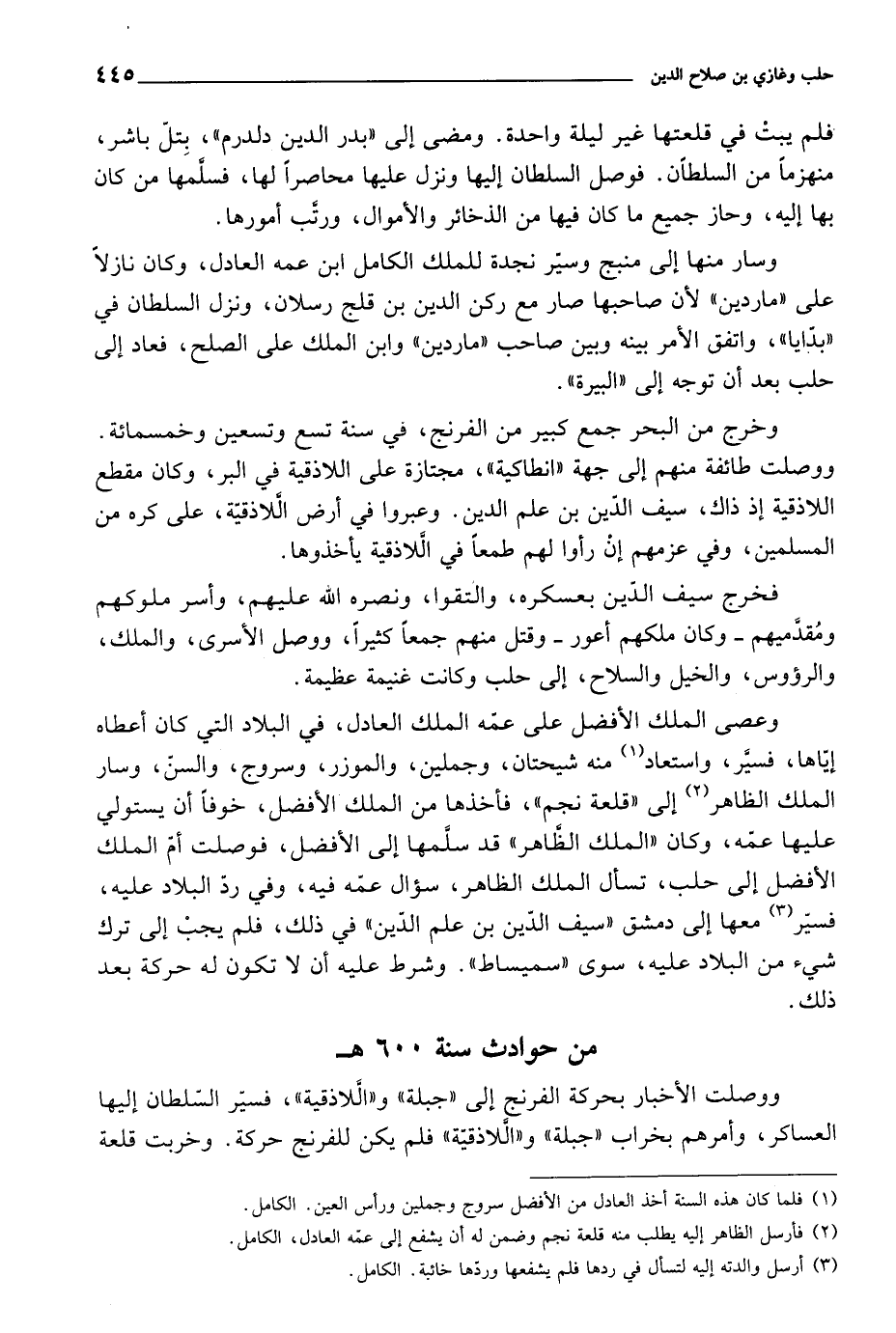 وعصى الملك الأفضل على عمه الملك العادل، في البلاد التي كان أعطاه إيا ها، فسير، واستعاد منه شيحتان، وجملين، والموزر، وسروج، والسن، وسار الملك الظاهر إلى قلعة نجم فأخذها من الملك الأفضل، خوفاً أن يستولي عليها عمه، وكان الملك الظاهر قد سلمها إلى الأفضل، فوصلت أم الملك الأفضل إلى حلب، تسأل الملك الظاهر، سؤال عمه فيه، وفي رد البلاد عليه، فسير معها إلى دمشق سيف الدين بن علم الدين في ذلك، فلم يجب إلى ترك شيء من البلاد عليه، سوى سميساط. وشرط عليه أن لا تكون له حركة بعد ذلك.