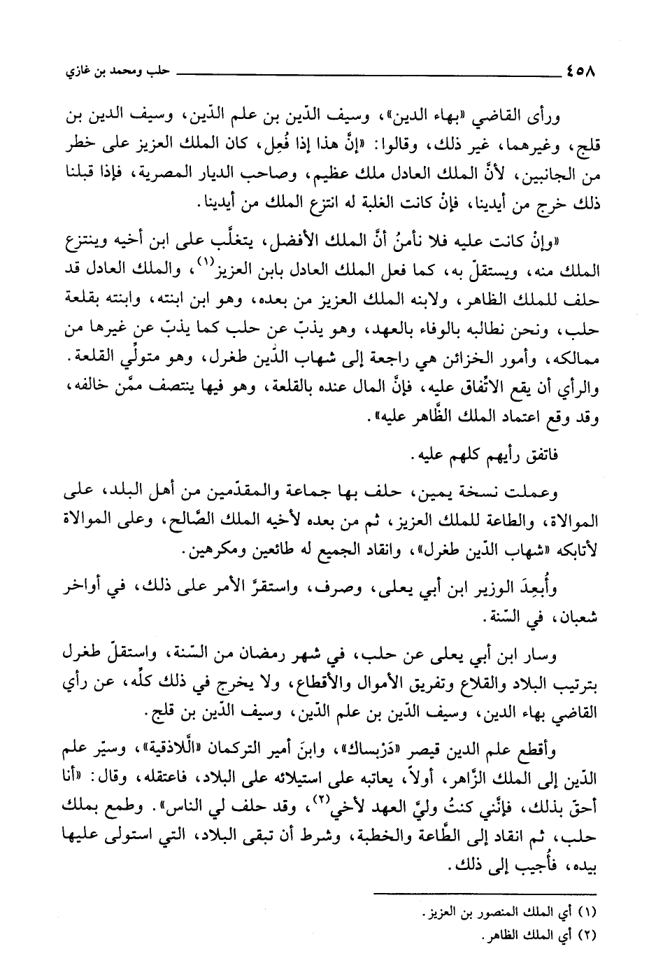 وإن كانت عليه فلا نأمن أن الملك الأفضل، يتغلب على ابن أخيه وينتزع الملك منه، ويستقل به، كما فعل الملك العادل بابن العزيز، والملك العادل قد حلف للملك الظاهر،، ولابنه الملك العزيز من بعده، وهو ابن ابنته، وابنته بقلعة حلب، ونحن نطالبه بالوفاء بالعهد، وهو يذب عن حلب كما يذب عن غيرها من ممالكه، وأمور الخزائن هي راجعة إلى شهاب الدين طغرل، وهو متولي القلعة. والرأي أن يقع الاتفاق عليه، فإن المال عنده بالقلعة، وهو فيها ينتصف ممن خالفه، وقد وقع اعتماد الملك الظاهر عليه.