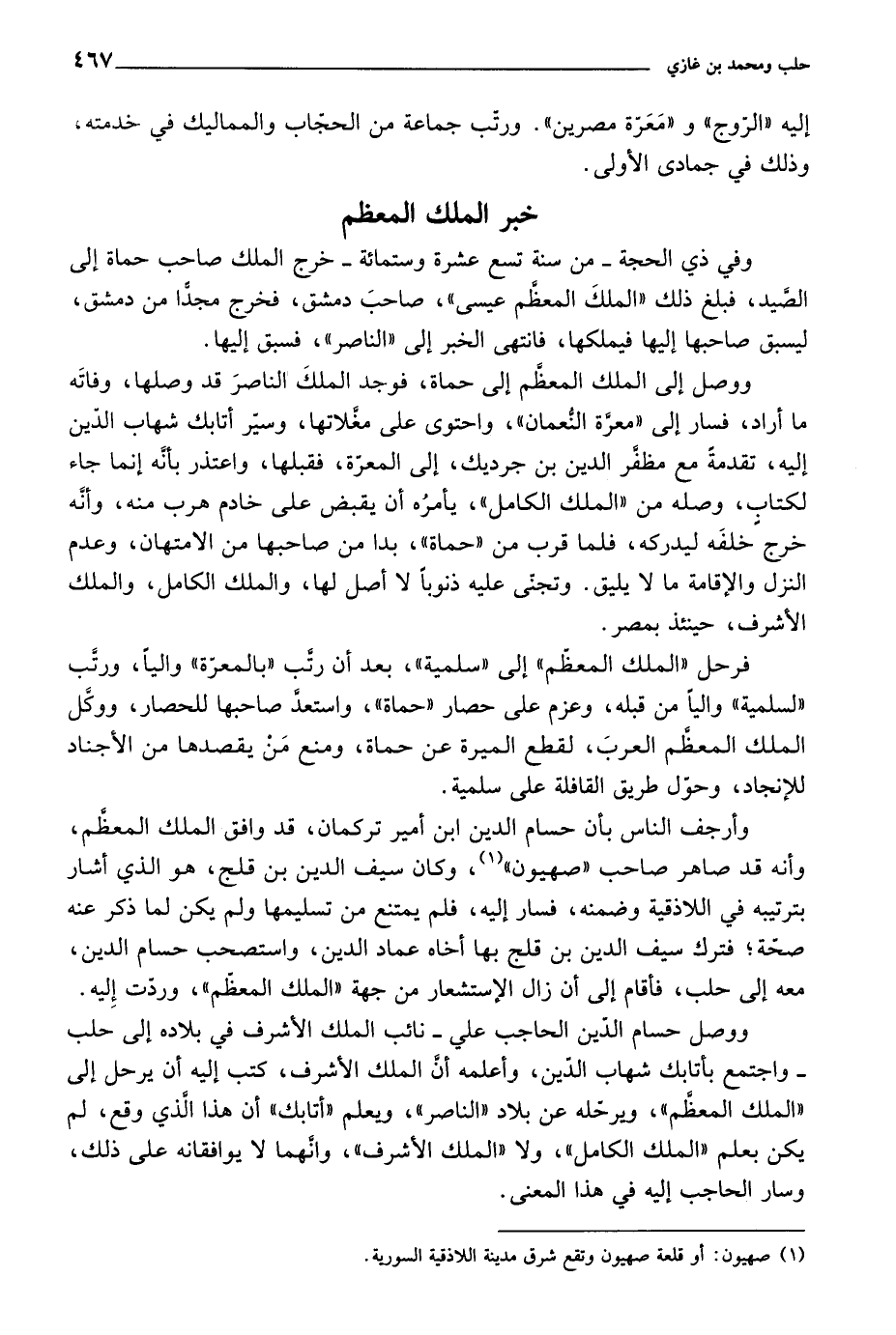 ووصل إلى الملك المعظم إلى حماة، فوجد الملك الناصر قد وصلها، وفاته ما أراد، فسار إلى معرة النعمان واحتوى على مغلاتها، وسير أتابك شهاب الدين إليه، تقدمة مع مظفر الدين بن جرديك، إلى المعرة، فقبلها، واعتذر بأنه إنما جاء لكتاب، وصله من الملك الكامل، يأمره أن يقبض على خادم هرب منه، وأنه خرج خلفه ليدركه، فلما قرب من حماة، بدا من صاحبها من الامتهان، وعدم النزل والإقامة ما لا يليق. وتجنى عليه ذنوباً لا أصل لها، والملك الكامل، والملك الأشرف، حينئذ بمصر.