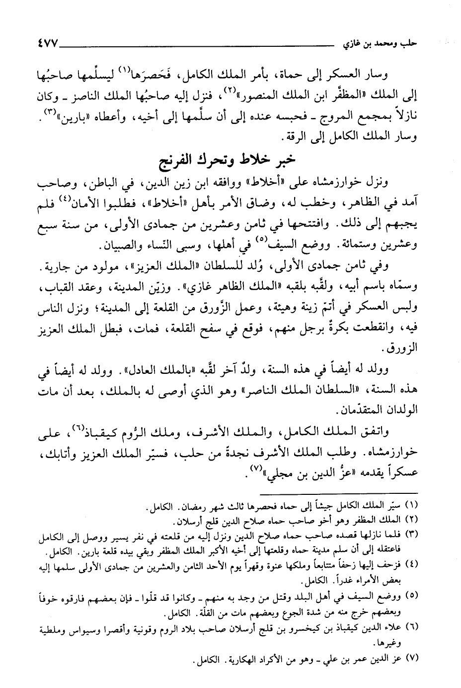 وسار العسكر إلى حماة، بأمر الملك الكامل، فحصرها ليسلمها صاحبها إلى الملك المظفر ابن الملك المنصور، فنزل إليه صاحبها الملك الناصر وكان نازلاً بمجمع المروج فحبسه عنده إلى أن سلمها إلى أخيه، وأعطاه بارين. وسار الملك الكامل إلى الرقة.