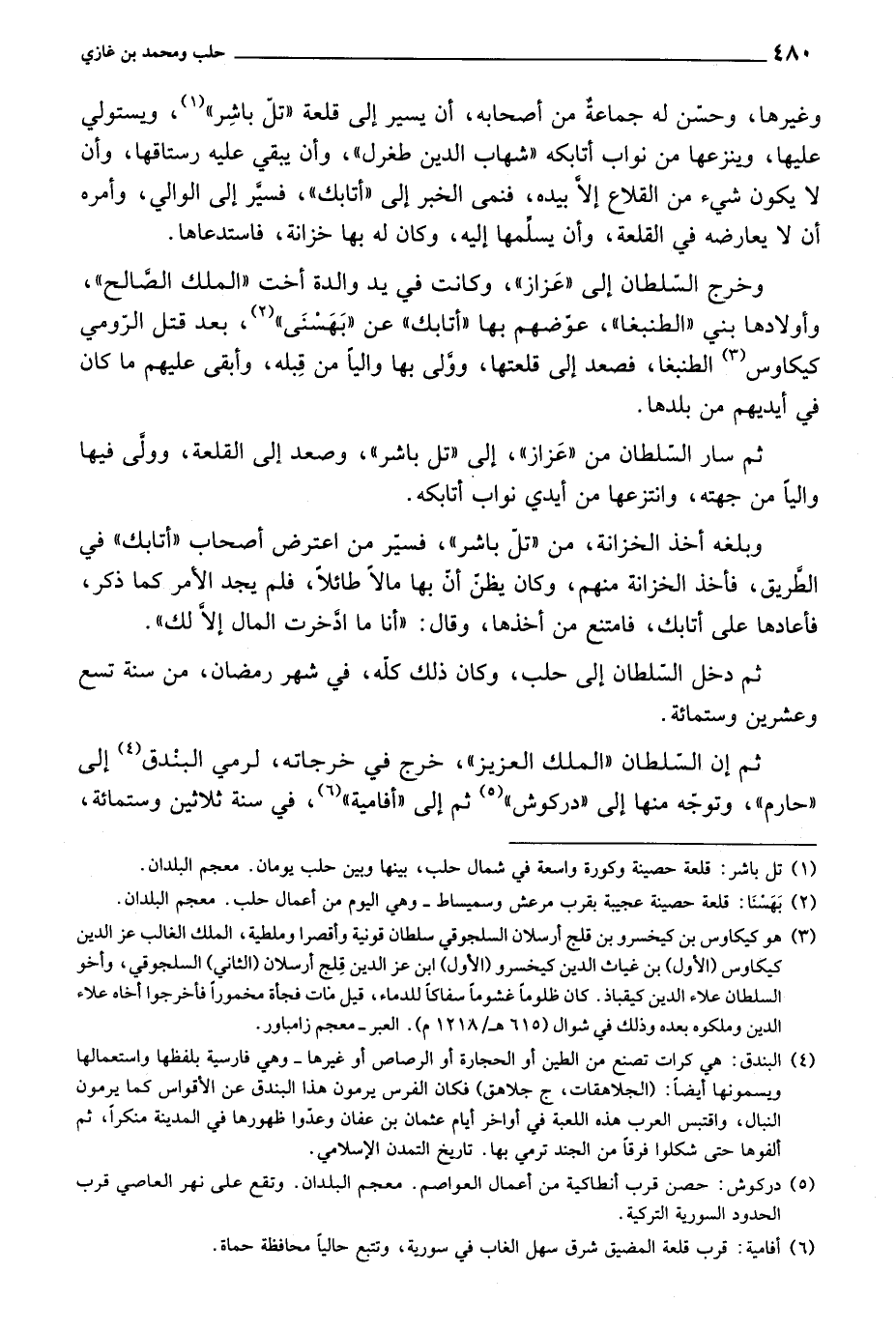 وغيرها، وحسن له جماعة من أصحابه، أن يسير إلى قلعة تل باشر، ويستولي عليها، وينزعها من نواب أتابكه شهاب الدين طغرل، وأن يبقي عليه رستاقها، وأن لا يكون شيء من القلاع إلا بيده، فنمى الخبر إلى أتابك، فسير إلى الوالي، وأمره أن لا يعارضه في القلعة، وأن يسلمها إليه، وكان له بها خزانة، فاستدعاها.