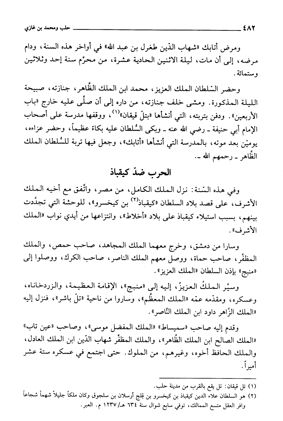 وسير الملك العزيز، إليه إلى منبج، الإقامة العظيمة، والزردخاناه، وعسكره، ومقدمه عمه الملك المعظم، وساروا من ناحية تل باشر، فنزل إليه الملك الزاهر داود ابن الملك الناصر.