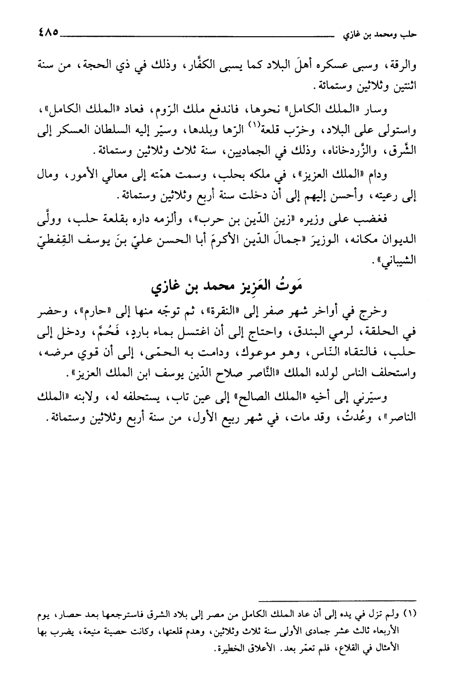 وخرج في أواخر شهر صفر إلى النقرة، ثم توجه منها إلى حارم، وحضر في الحلقة، لرمي البندق، واحتاج إلى أن اغتسل بماء بارد، فحم، ودخل إلى حلب، فالتقاه الناس، وهو موعوك، ودامت به الحمى، إلى أن قوي مرضه واستحلف الناس لولده الملك الناصر صلاح الدين يوسف ابن الملك العزيز. وسيرني إلى أخيه الملك الصالح إلى عين تاب، يستحلفه له، ولابنه الملك الناصر، وعدت، وقد مات، في شهر ربيع الأول، من سنة أربع وثلاثين وستمائة