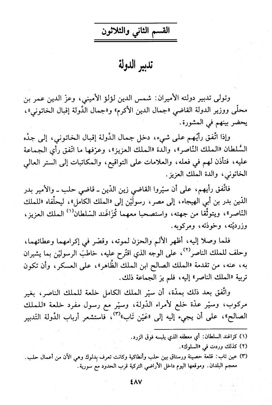 القسم الثاني والثلاثون تدبير الدولة وتولى تدبير دولته الأميران: شمس الدين لؤلؤ الأميني، وعر الدين عمر بن محلى ووزير الدولة القاضي جمال الدين الأكرم وجمال الدولة إقبال الخاتوني، يحضر بينهم في المشورة. وإذا اتفق رأيهم على شيء، دخل جمال الدولة إقبال الخاتوني، إلى جده السلطان الملك الناصر، والدة الملك العزيز، وعرفها ما اتفق رأي الجماعة عليه، فتأذن لهم في فعله، والعلامات على التواقيع، والمكاتبمات إلى الستر العالي الخاتوني، والدة الملك العزيز. فاتفق رأيهم، على أن سيروا القاضي زين الذين - قاضي حلب - والأمير بدر الدين بدر بن أبي الهيجاء، إلى مصر، رسولين إلى الملك الكامل، ليحلفاه للملك الناصر، ويتوثقا من جهته، واستصحبا معهما كزاغند السلطان الملك العزيز، وزرد يته، وخوذته، ومركو به.