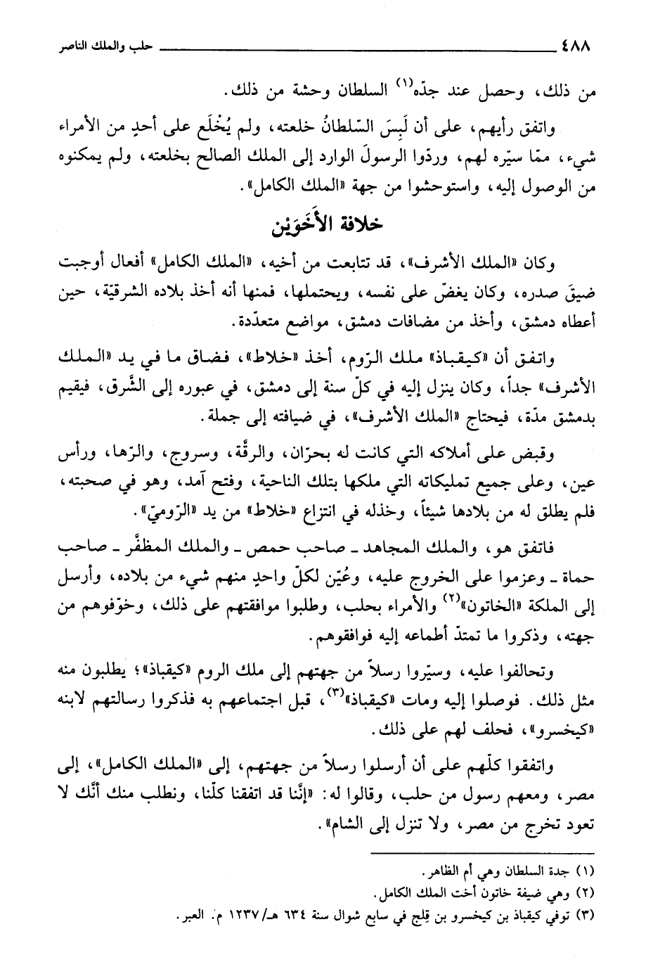 وتحالفوا عليه، وسيروا رسلاً من جهتهم إلى ملك الروم كيقباذ، يطلبون منه مثل ذلك. فوصلوا إليه ومات كيقباذ، قبل اجتماعهم به فذكروا رسالتهم لابنه كيخسرو، فحلف لهم على ذلك.