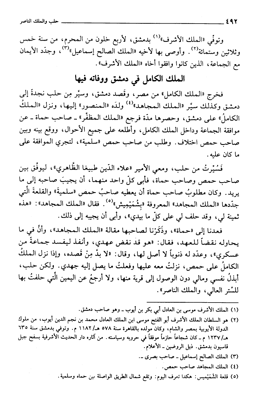 فعدنا إلى حماة، وذكرنا لصاحبها مقالة الملك المجاهد، وأن في ما يحاوله نقضاً للعهد، فقال: هو قد نقض عهدي، وأنفذ ليفسد جماعة من عسكري، وعدد له ذنوباً لا أصل لها، وقال: لا بد من قصده، وإذا نزل الملك الكامل على حمص، نزلت معه عليها وفعلت ما يصل إليه جهدي. ولكن حلب، أبذل نفسي ومالي دون الوصول إلى قرية منها، ولا أرجع عن اليمين التي حلفت بها للستر العالي، والملك الناصر.