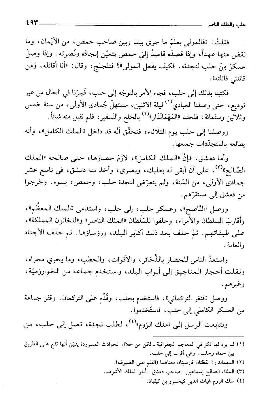 فكتبنا بذلك إلى حلب، فجاء الأمر بالتوجه إلى حلب، فسرنا في الحال من غير توديع، حتى وصلنا العبادي ليلة الاثنين، مستهل جمادى الأولى، من سنه خمس وثلاثين وستمائة، فلحقنا المهماندار بالخلع والتسفير، فلم نقبل منه شيئاً. ووصلنا إلى حلب يوم الثلاثاء، فتحقق أنه قد داخل الملك الكامل، وأنه يطالعه بالمتجددات جميعها.