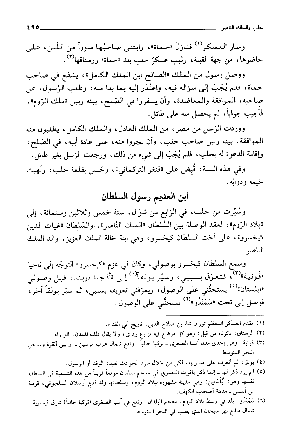 وسيرت من حلب، في الرابع من شوال، سنة خمس وثلاثين وستمائة، إلى بلاد الروم، لعقد الوصلة بين السلطان الملك الناصر، والسلطان غياث الدين كيخسرو، على أخت السلطان كيخسرو، وهي ابنة خالة الملك العزيز، والد الملك الناصر.