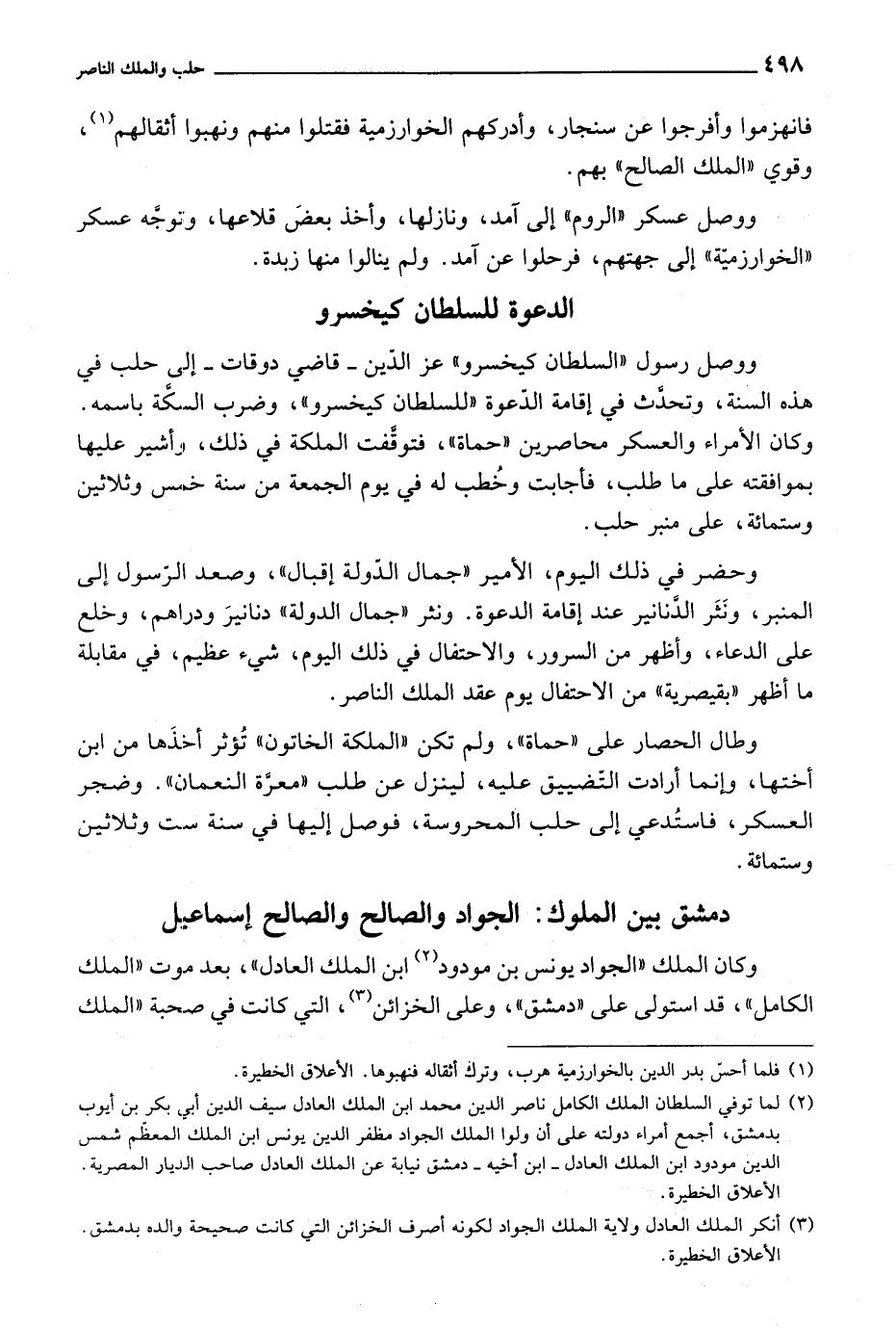 ووصل رسول السلطان كيخسرو، عز الدين، قاضي دوقات، إلى حلب في هذه السنة، وتحدث في إقامة الدعوة للسلطان كيخسرو، وضرب السكة باسمه. وكان الأمراء والعسكر محاصرين حماة، فتوقفت الملكة في ذلك، وأشير عليها بموافقته على ما طلب، فأجابت وخطب له في يوم الجمعة من سنة خمس وثلاثين وستمائة، على منبر حلب.