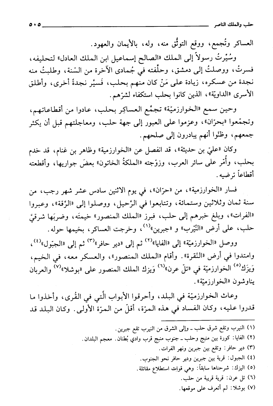 فسار الخوارزمية، من حران، في يوم الاثنين سادس عشر شهر رجب، من سنة ثمان وثلاثين وستمائة، وتتابعوا في الرحيل، ووصلوا إلى الرقة، وعبروا الفرات، وبلغ خبرهم إلى حلب، فبرز الملك المنصور خيمته، وضربها شرقي حلب، على أرض النيرب وجبرين، وخرجت العساكر، بخيمها حوله. ووصل الخوارزمية إلى الفايا ثم إلى دير حافر ثم إلى الجبول وامتدوا في أرض النقرة. وأقام الملك المنصور، والعسكر معه، في الخيم ويزك الخوارزمية في تل عرن ويزك الملك المنصور على بوشلا والعربان يناوشون الخوارزمية.