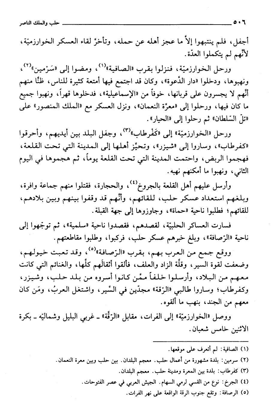 فسارت العساكر الحلبية، لقصدهم، فقصدوا ناحية سلمية، ثم توجهوا إلى ناحية الرصافة، وبلغ خبرهم عسكر حلب، فركبوا، وطلبوا مقاطعتهم.