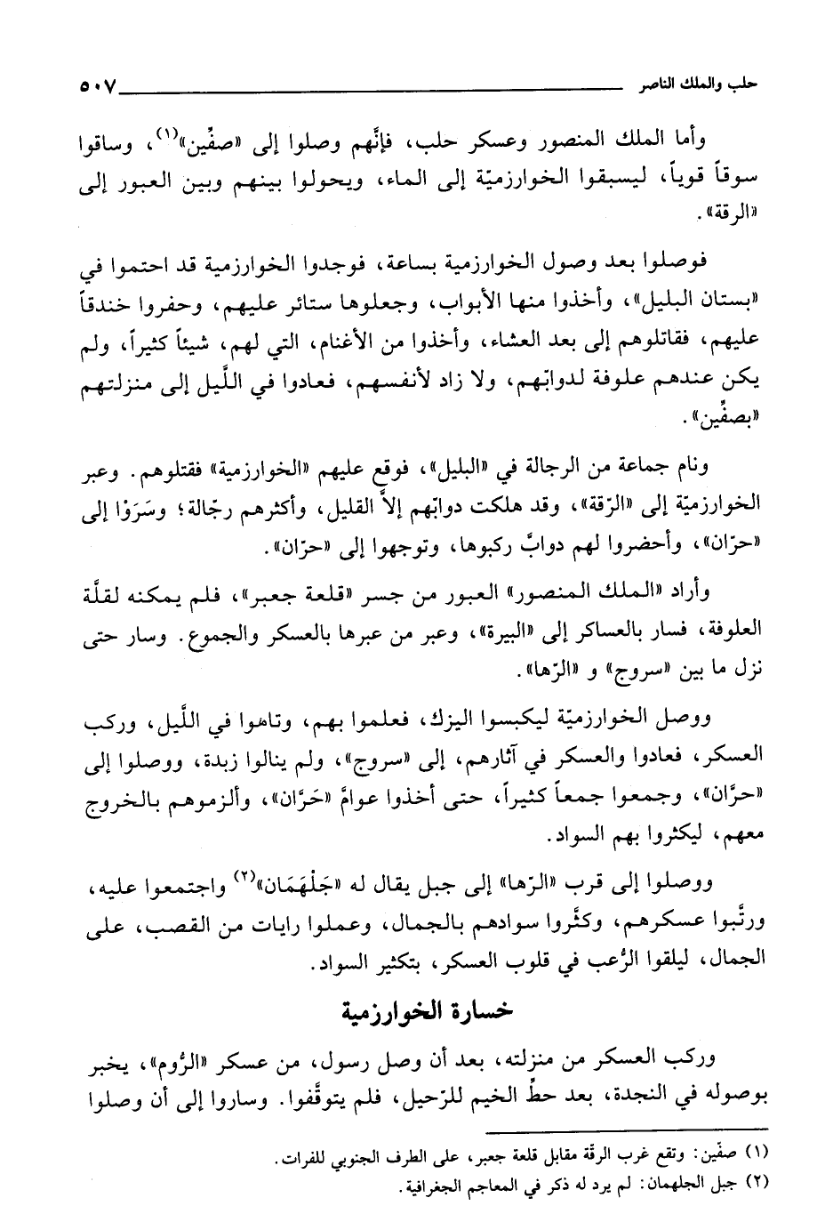 وأما الملك المنصور وعسكر حلب، فإنهم وصلوا إلى صفين، وساقوا سوقاً قوياً، ليسبقوا الخوارزمية إلى الماء، ويحولوا بينهم وبين العبور إلى الرقة.