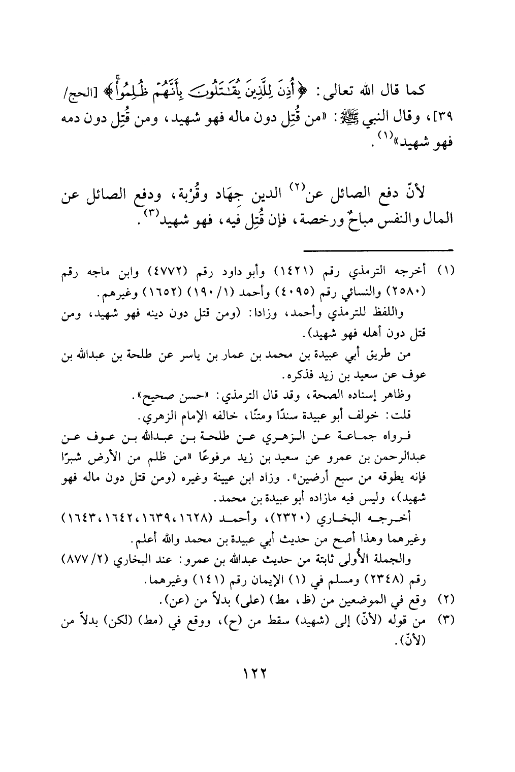 واللفظ للترمذي وأحمد، وزادا: (ومن قتل دون دينه فهو شهيد، ومن قتل دون أهله فهو شهيد).